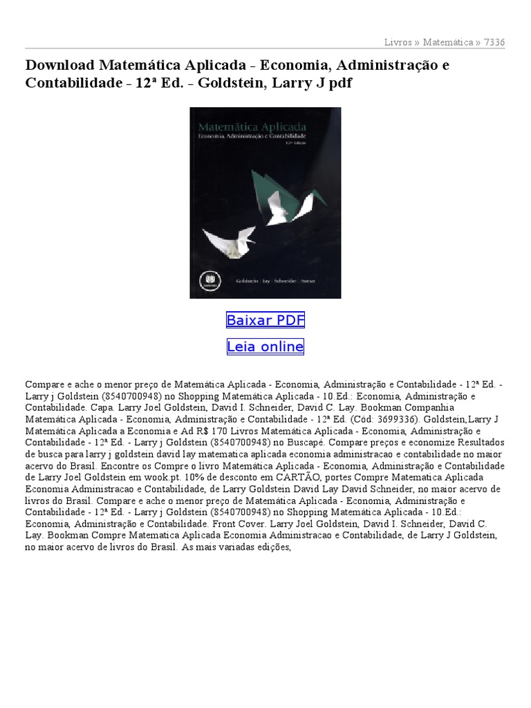 Matemática aplicada a administração e economia apresenta uma abordagem intuitiva e de fácil compreensão, tornando se um excelente material para utilização em sala de aula dos cursos 0 response to pdf matemática aplicada: Mesmo nas economias mais simples, é necessário sustentar os relatórios dos ativos, das dívidas e das transações com terceiros. Aplicada à administração, economia e contabilidade. Tan.pdf as pdf for free.