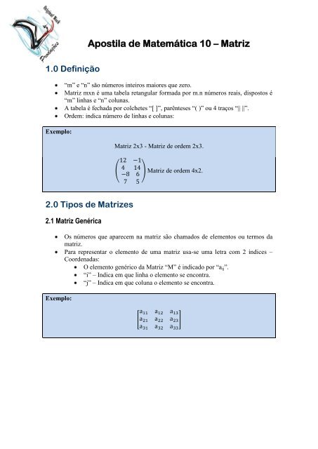Matemática Matrizes. In mathematics, a matrix (plural matrices) is a rectangular array or table of numbers, symbols, or expressions, arranged in rows and columns. São as entradas da matriz.