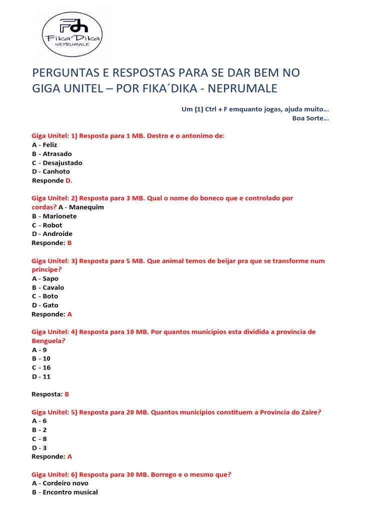 Perguntas E Respostas Do Jogo Giga Unitel Pdf. Perguntas e respostas para se dar bem no. 2) resposta para 3 mb.