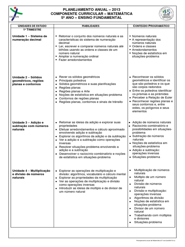 Matemática 5 Ano Ensino Fundamental. Baixe para imprimir o arquivo pdf com o planejamento anual de conteúdos de matemática 5º ano e plano de aula. Matematica 5º ano ensino fundamental i.